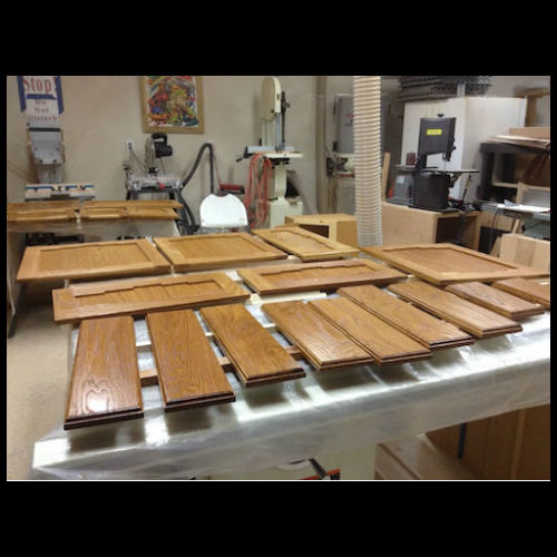 I used 1/4” double sided oak plywood for the center panel. I started by breaking down the large sheet with a circular saw and a guide. Once it was in more manageable sizes, I ripped the pieces to size on the table saw. Then I started the gluing processes . I rotated about three or four doors through at a time, and in a few hours, they were all glued up. I gave them another quick pass with the random orbit sander.