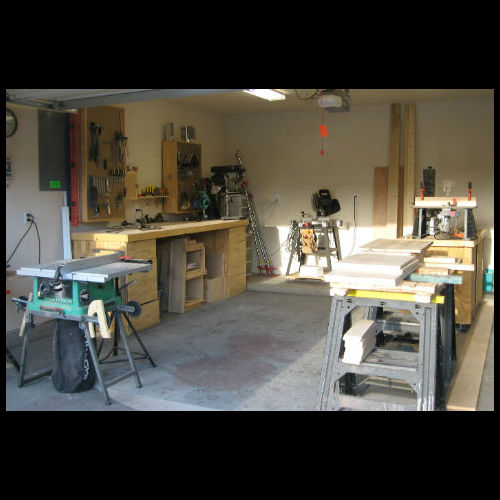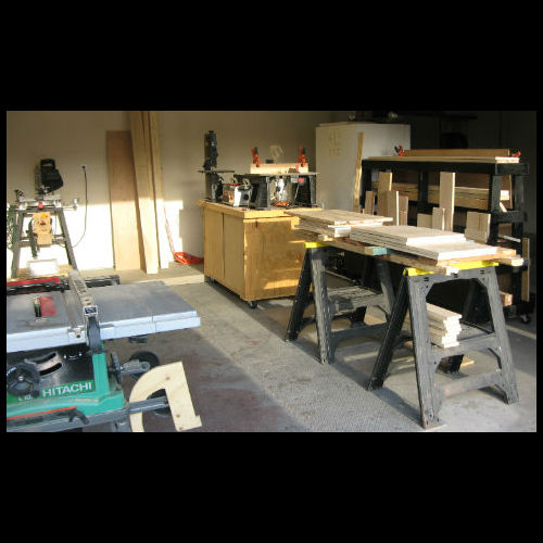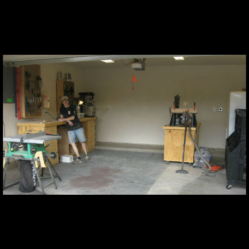 Before he arrived I got up crazy early to get everything out of the shop so he could get around. What I discovered is that I'm a wood hoarder – I have a really hard time throwing away a piece of wood. I do sometimes make small projects, and I always think I better keep that piece cause I could use it for something. Right – never happens. I had a driveway full of wood – perhaps that's why I had no work space. While he was running lines I began building a wood storage rack. It took me nearly all day to do that small project, but it was hard to get to tools in the hot sun in the driveway. After about 7 hours of working he called me out to the shop and he turned on the seven new quad lights he had installed. I thought it was a Griswold Christmas in my garage. It was amazing – there goes my excuse for errors in my projects. I spent the rest of the evening moving back in the garage and by 8 pm I was fried, dehydrated, sore, filthy, and the happiest woodworker on the face of the earth. How is that a long, hot, dirty day in the shop is always better than an easy day in the air conditioned office? It must be the good old blue-collar blood in my veins.