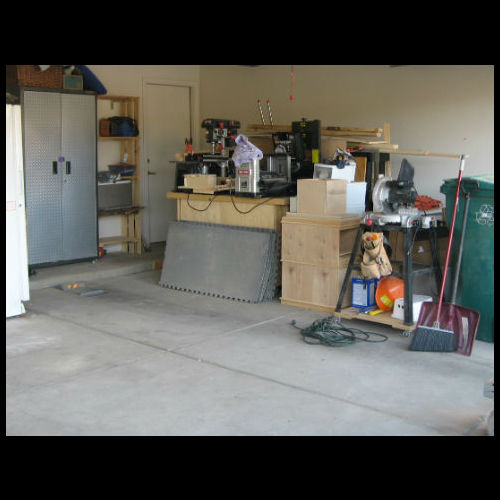 I even gave away my old very large workbench (new bench is coming soon). Then I got to work cleaning and preparing the floor. They tell me the secret to a good epoxy floor is in the preparation. I believe if mine fails due to poor prep then there's just no way possible to prepare for an epoxy floor. I swept and swept and then swept some more. Then I ran the shopvac. There has never been a vehicle parked in that space so I didn't have oil or tire stains, but I did have a few places where I had spilled some stain and finish. So I got out the hand grinder and set to work; about four hours later I had nearly grinded the whole floor. I then got out the degreaser/cleaner and hosed down the space and scrubbed with a very course brush. I rinsed it all off several times and then went for the etching chemical and after two full applications and four rinses, I was beat. I let it dry for about 14 hours, and it was bone dry at 0600 the next morning so I swept one more time. I then set to work on mixing the epoxy and spreading it on. This was actually the easy part after the hours of gridding and scrubbing. About 2 hours later it was all coated nicely and drying fast. I'm quite happy with it right now. Give me a few months and I'll let you know how it's holding up.