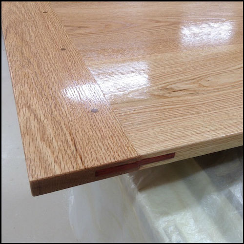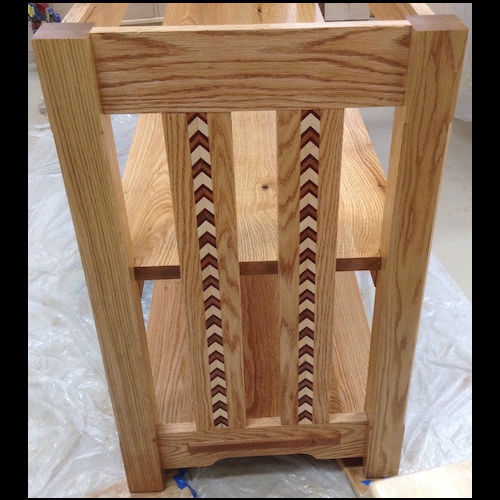 First, you see the Sketchup model I created to use as a pattern. I made a few adjustments along the way but mostly it’s what I originally designed. Next, you see the large top. It’s 72”X24” jointed from 5/4 stock. I also joined the two shelves. Not quite as big but still three large glue ups. I put my card scraper to good use on this project. The next image is the side. The legs are jointed 8/4 board to make 2 1/2" squares. The side rails and slats are made of 4/4 oak. The bottom rail has a slight Greene and Greene style curve with a through-tenon for the bottom shelf. The slats have an inlay made of padauk, mahogany, and maple. Finally, you’ll see the breadboard ends with pegs and padauk splines. I wrote an article a couple of weeks ago on the breadboard ends. Check it out if you’d like to know how I built them.