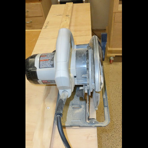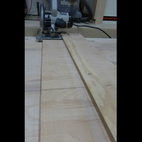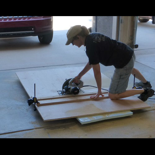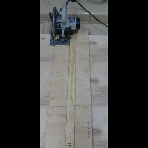 Building the guide: I made mine 4' long--the width of some leftover ¾" birch plywood, but if you have a full sheet to use and want to make yours up to 8' long to support full lenght cuts (and you have the storage space), I would highly recommend that. First, cut the base piece about double the width of the base of your circular saw. Then cut a guide strip from ½" plywood (if you use ¾" the motor/frame of your circular saw will hit the guide and cause the cut to be angled) about 2-3" wide and the same length as your ¾" base. Place and screw the guide to the base so that there is about a ½" or so to be removed from the base when you run the saw down the guide for the first time. This will create a perfectly accurate cut to use as a guide for future cuts. Once the guide is set up square and straight, rub on some wax so the circular saw will glide across it with ease.