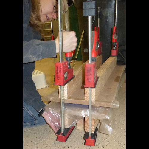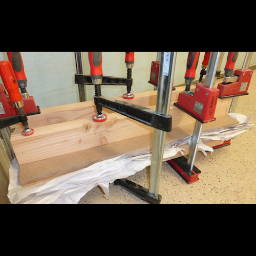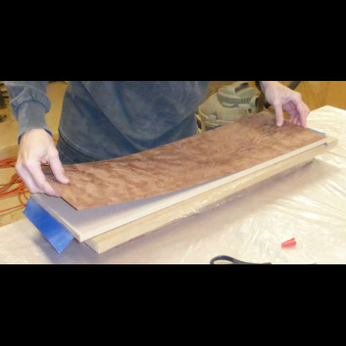 First thing to do is build the platens. I used 3/4" MDF. I cut the pieces about 8" wide and 36" long (image1). I ordered some cork board in a roll from Amazon and used spray on adhesive to secure it to the MDF (image 2). I clamped the boards together and let the adhesive set. Next, I spread out some plastic over my workbench and carefully unwrapped the veneer. It's a good idea to label the sheets (image 3) I laid it out flat and sprayed the veneer softener over each sheet front and back (image 4). I let them sit for about ten minutes so it could soak in, and then I set up my platens with two cauls on the bottom and started building a veneer sandwich--first a layer packing paper, then a vinyl screen, then a sheet of veneer, then paper, screen, veneer until all the sheets of veneer are stacked and separated by screen and paper. I then put the top platen on with two cauls directly under the bottom cauls and clamped! I left the giant and heavy veneer sandwich for 24 hours (image 5). I opened it up on Monday when I got home from work and the sheets were beautiful and perfectly flat. They were a little cool to the touch still so I placed them all back in the platen with dry paper between them and sealed it up again until the weekend.