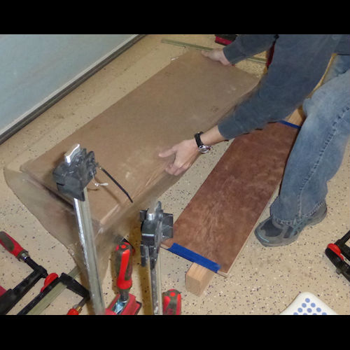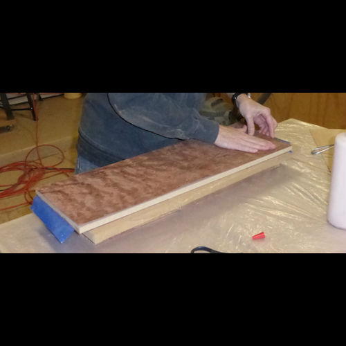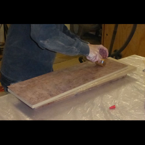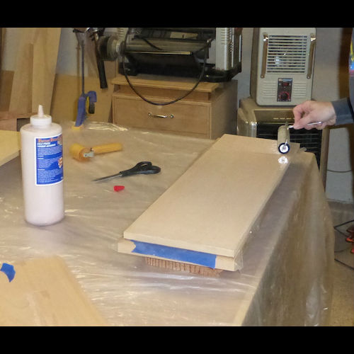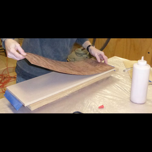 I cut my 1/2" MDF to size and then used the MDF as a guide and straight edge to cut the veneer to size. I ran the veneer saw flush against the edge of the MDF several times until the veneer separated. Use moderate pressure so you don't tear the veneer—let the saw do the work. (image 6) With the veneer cut to size, it was time to start gluing. I spread a thick layer of veneer glue on the sub-straight (image 7) and then placed the veneer on the glued surface (image 8) and pressed it down with the roller (image 9). I used blue tape and secured the ends so the pieces didn't roll up (image 10, 11). I repeated the process for the other side (image 12, 13, 14) and placed it all in the platens (image 15, 16, 17). Make sure you cover the cork with plastic or packing tape in case the glue seeps through the veneer. Continue with all your pieces and stack them in the platens with a piece of plastic between each veneered sub-straight. Now wait at least 24 hours for a beauitful veneered surface.