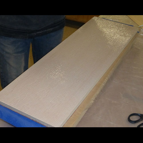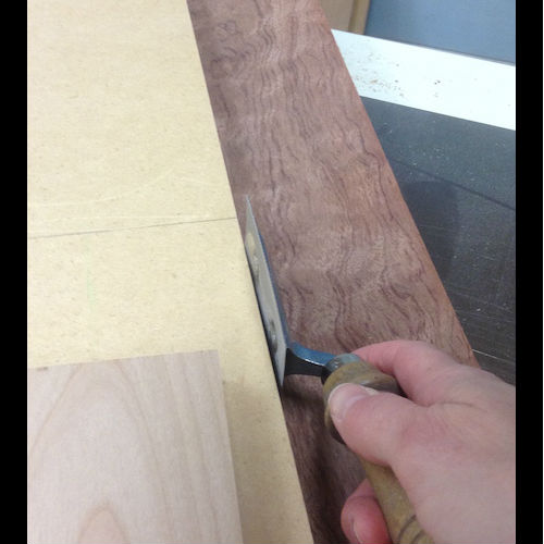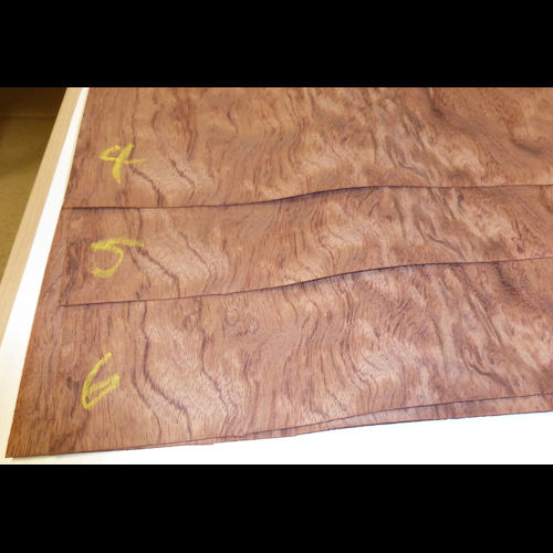 I ordered my veneer, veneer softener and glue at Veneer Supplies . The veneer was beautiful and shipped professionally and quickly. Since I had never done this before, I ordered the Veneering Essentials Combo. I got a sharpened veneer saw and glue roller as well. I ordered enough bubinga, a reddish Africa hardwood, veneer to build a box 11"x6.5"x4.5" If you know anything about veneering you're probably wondering if I had to buy a veneer press. The answer is no. I probably wouldn't have tried veneering if I'd had to make a lot of major purchases. I used Marc's platen technique — two long flat pieces of MDF covered in cork with two 3" cauls on either side to apply even pressure to the veneer-covered board--1/2" thick MDF, the sub-straight.